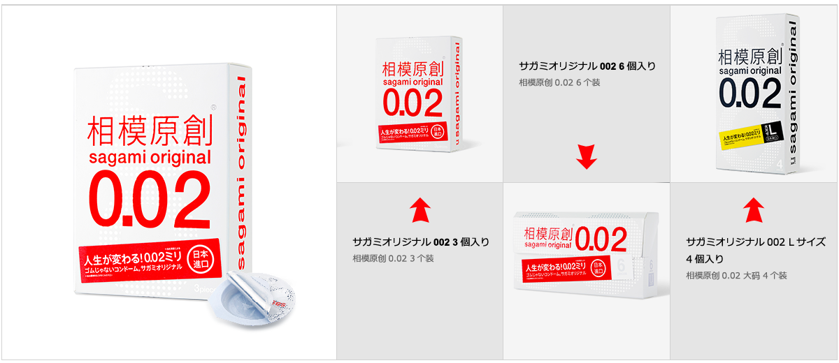 sagami original 0.02 (相模原創(chuàng)0.02系列), 是日本相模橡膠工業(yè)株式會社于1998年推出首次創(chuàng)新發(fā)明并向日本市場的一種以聚氨基甲酸酯 (高分子材料)為原料制成的非乳膠安全套, 厚度僅0.02mm, 是傳統(tǒng)的橡膠產(chǎn)品“厚度一半,強度三倍”, 并且擁有高導(dǎo)熱性能,讓產(chǎn)品使用體驗更加美妙!